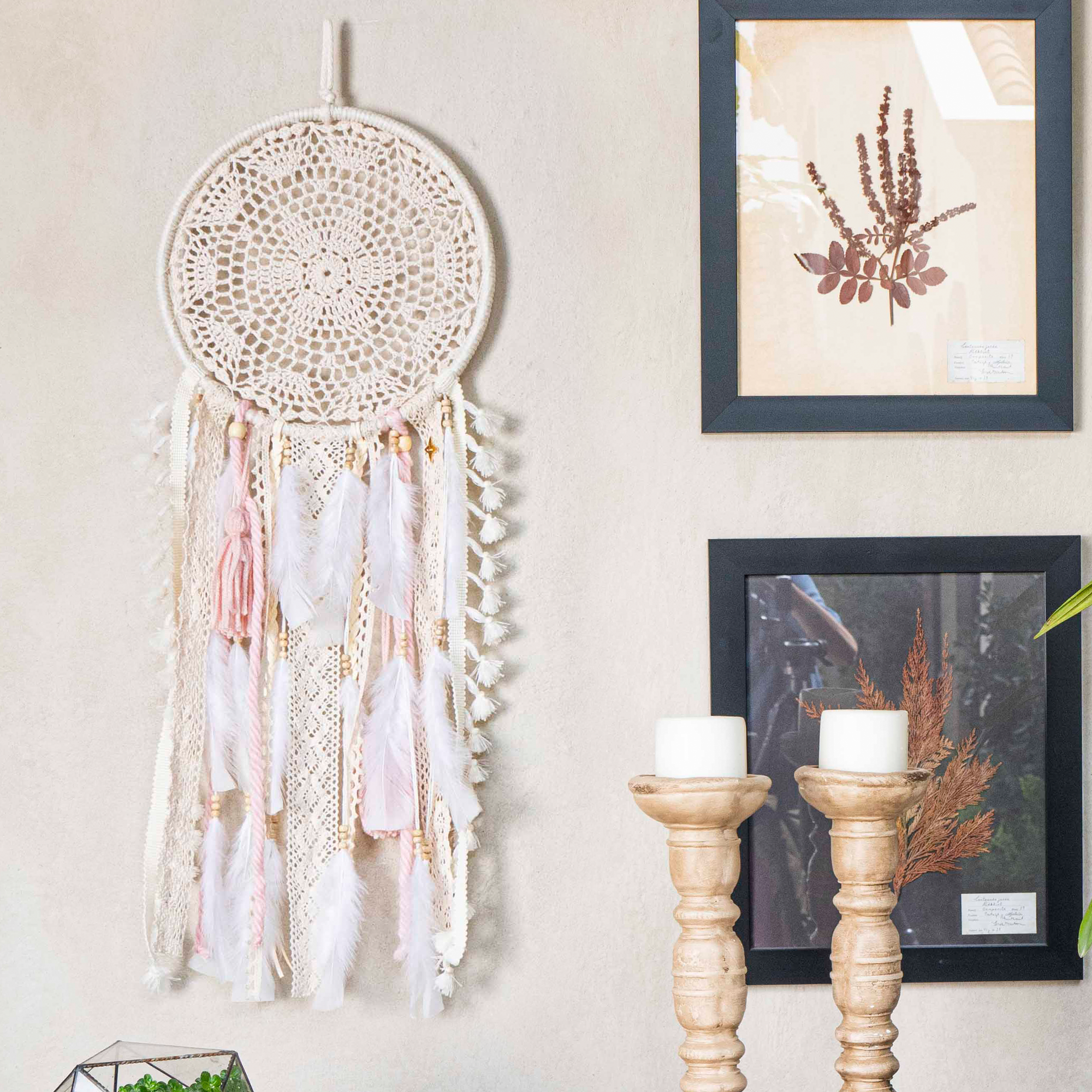 Cada noche, contempla tu atrapasueños beige & rosa: