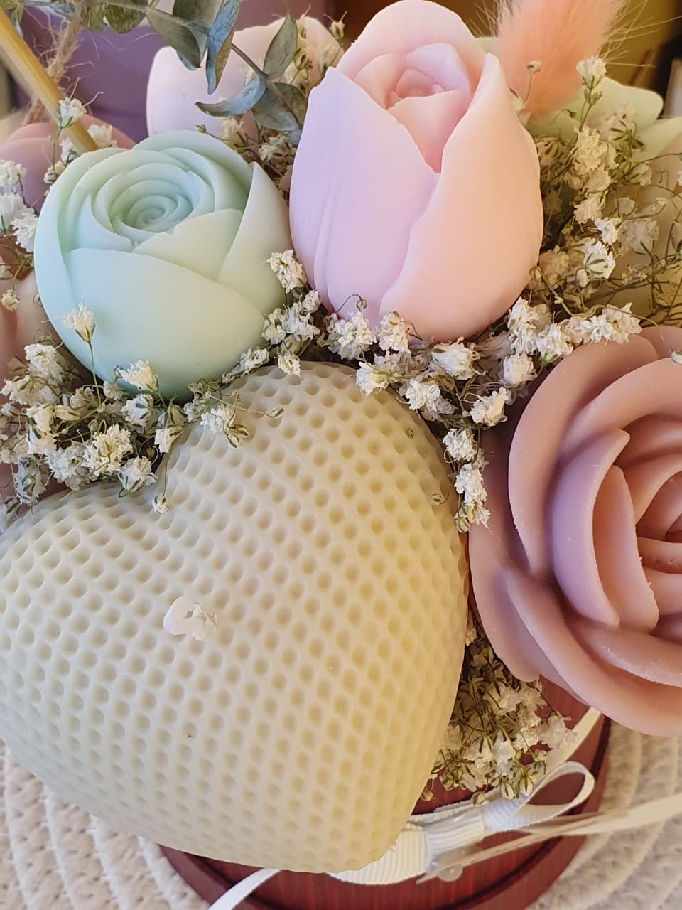 • 🌸 Incluye rosas, tulipanes y un corazón en cera, cuidadosamente trabajados a mano.