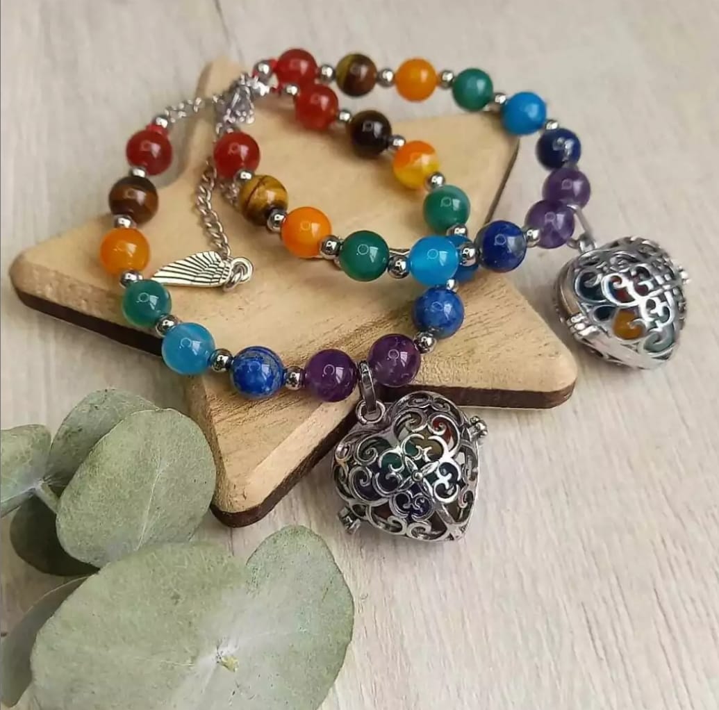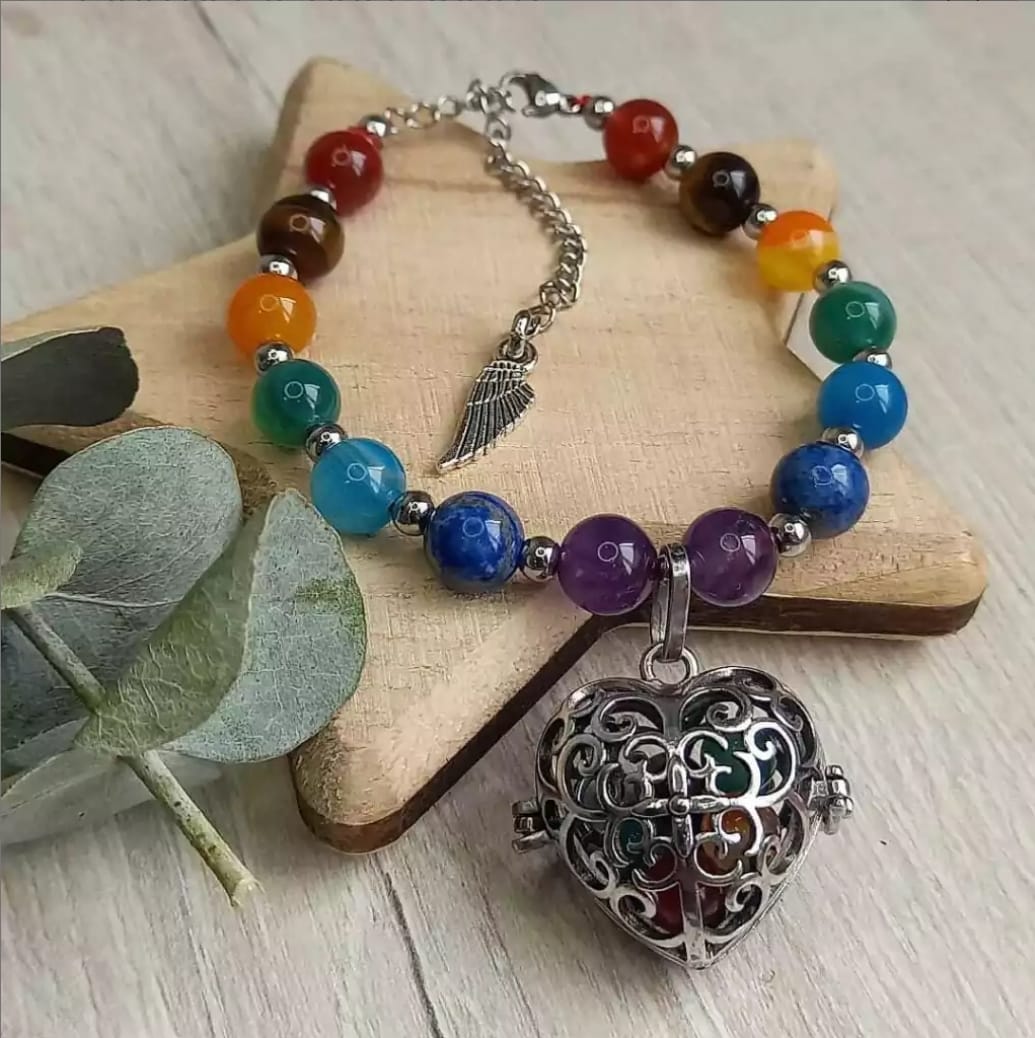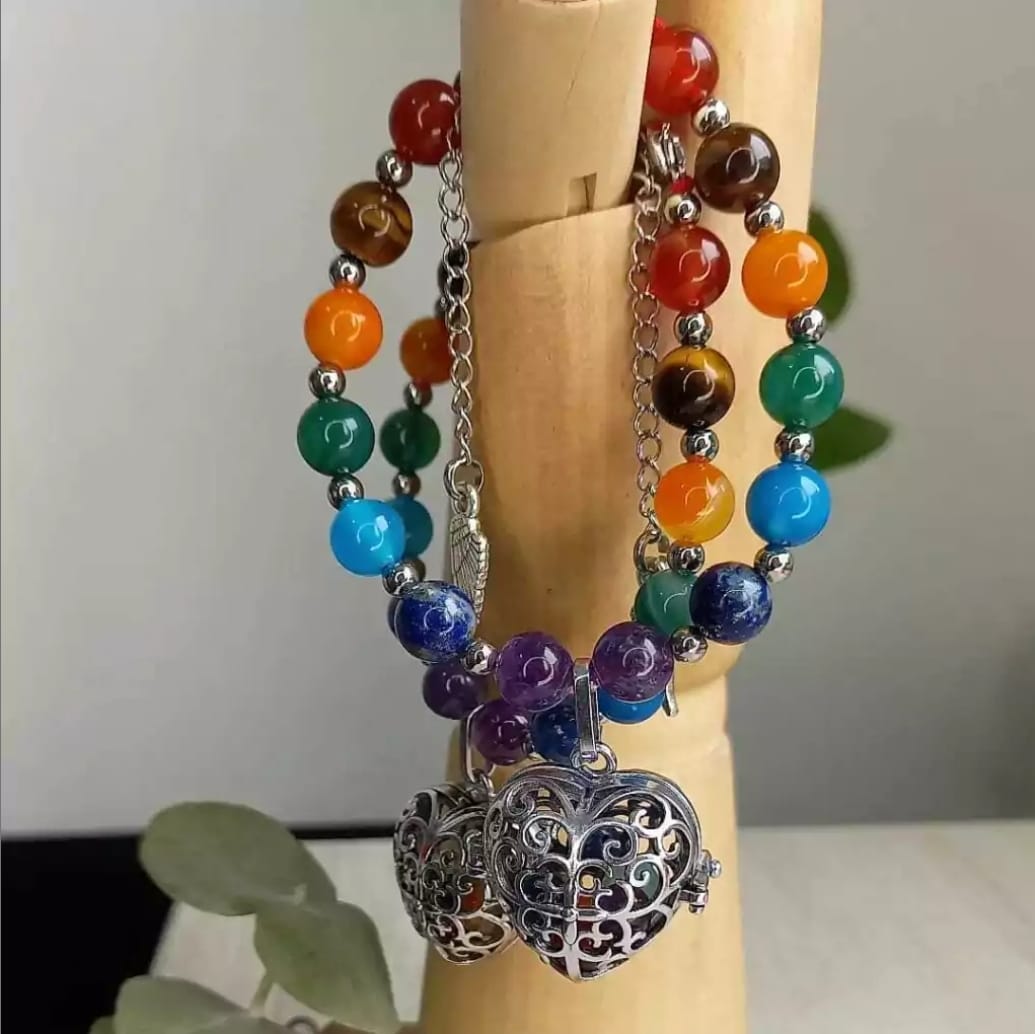 Una joya espiritual que armoniza tus chakras y eleva tu energía, mientras llama a la protección y guía de tus ángeles. Hecha con piedras naturales y dije llamador en forma de corazón.
