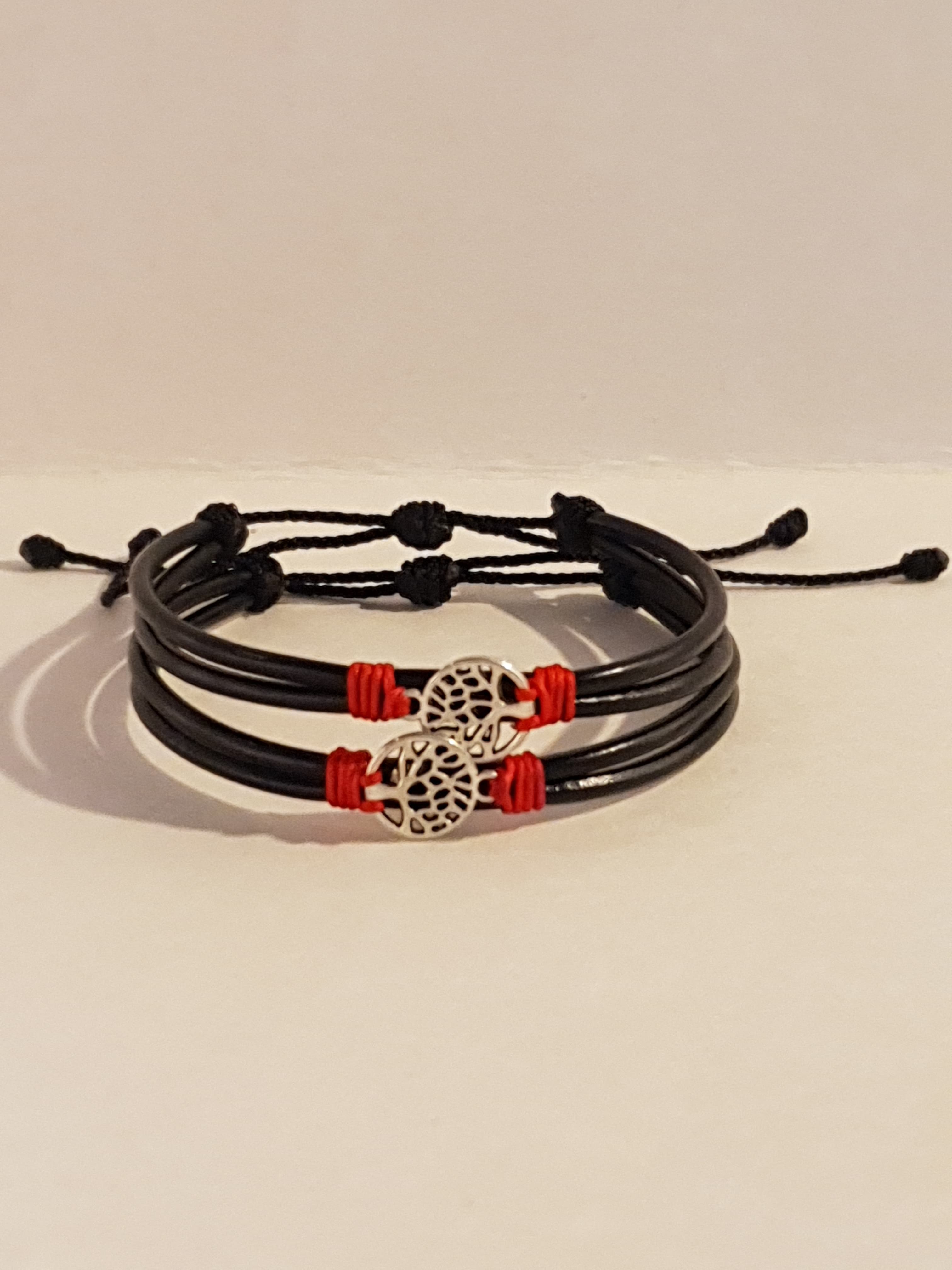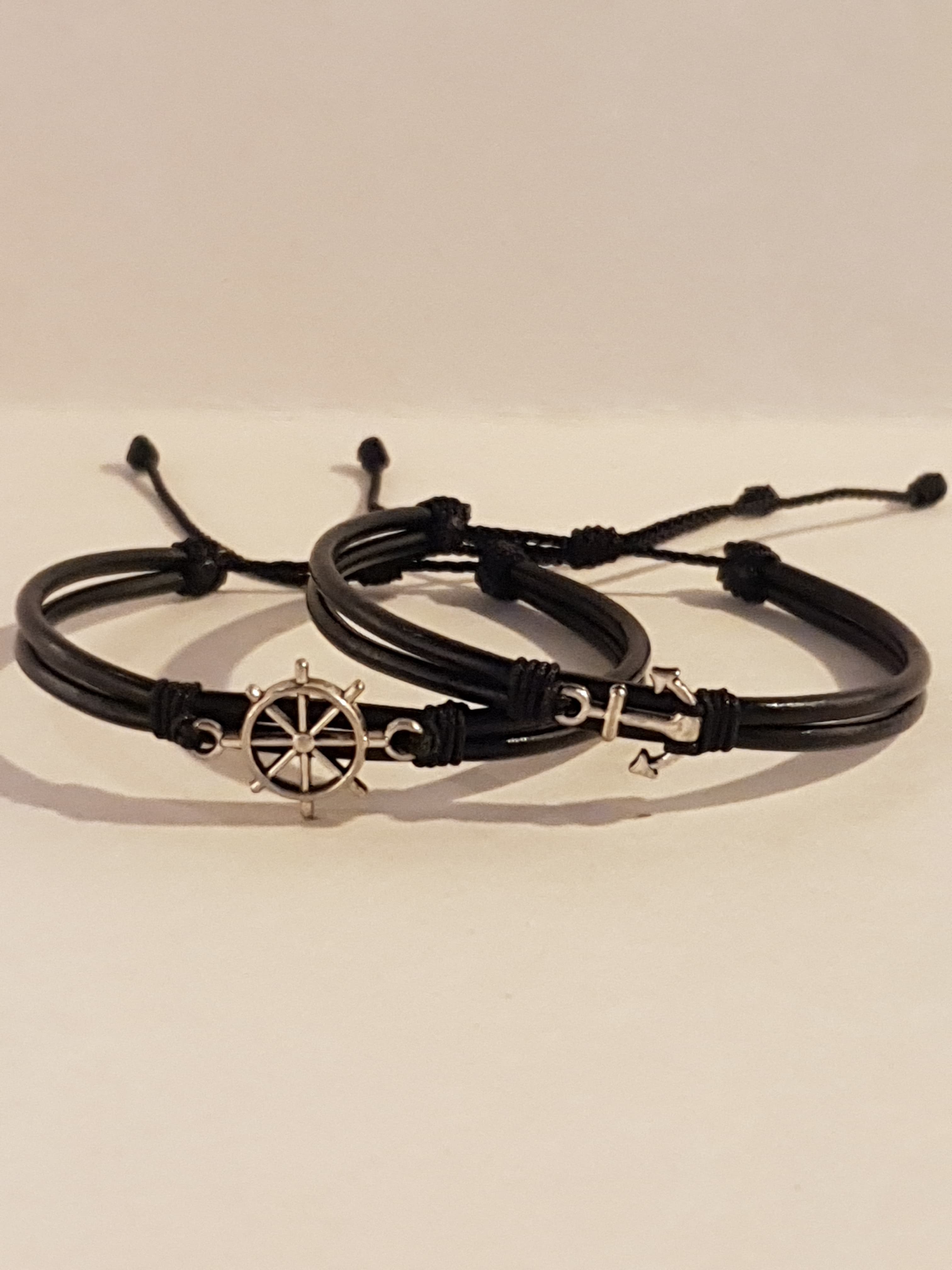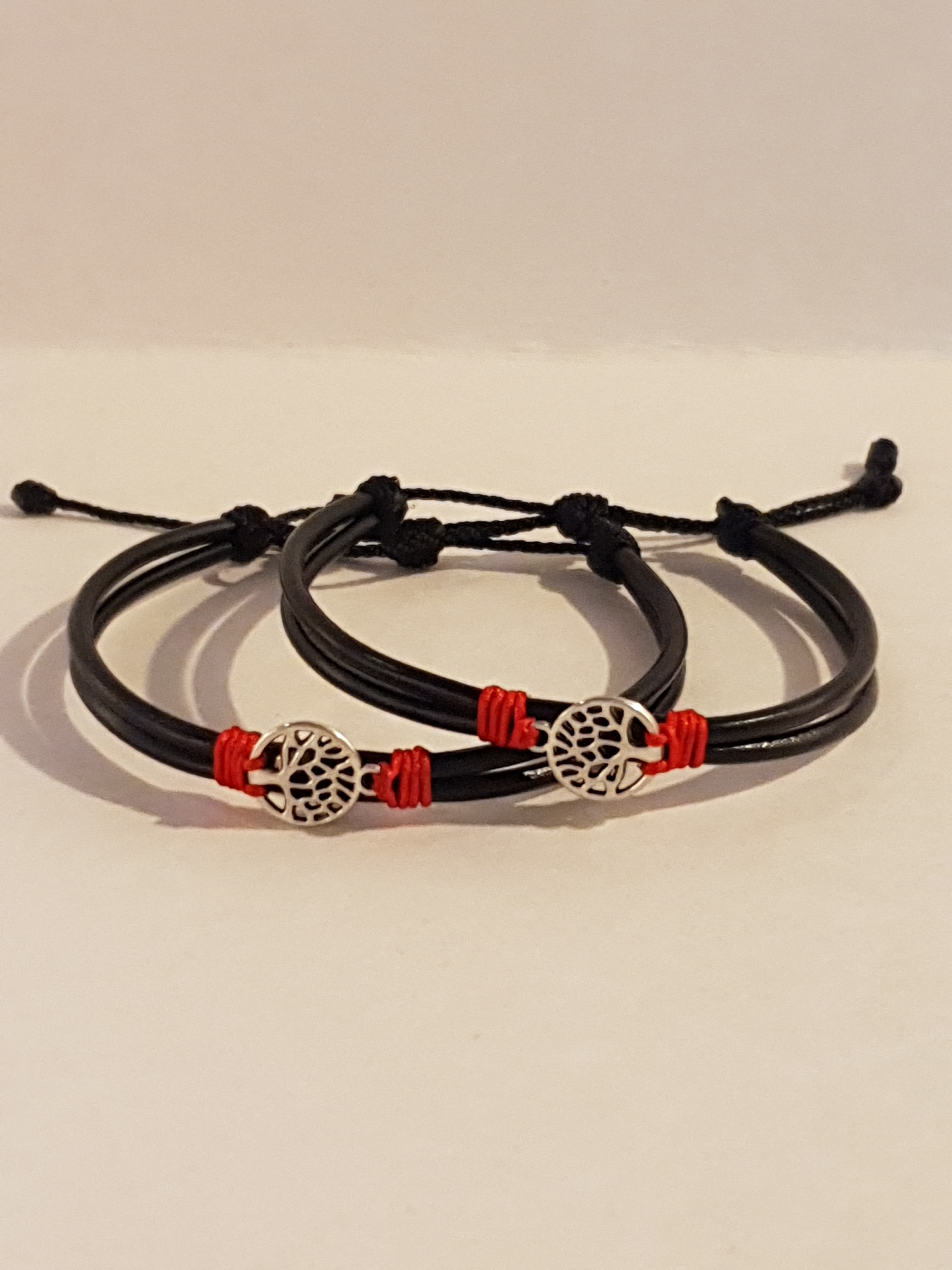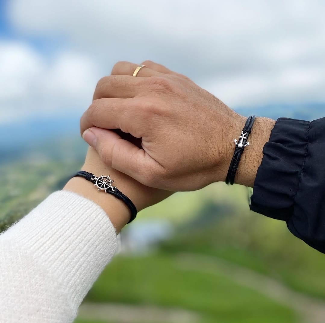 Un par de Manillas de cuero ajustables, creadas para compartir con esa persona que te acompaña en el viaje de la vida. Cada símbolo representa una conexión especial: raíces compartidas, dirección, fe, amor eterno y más.