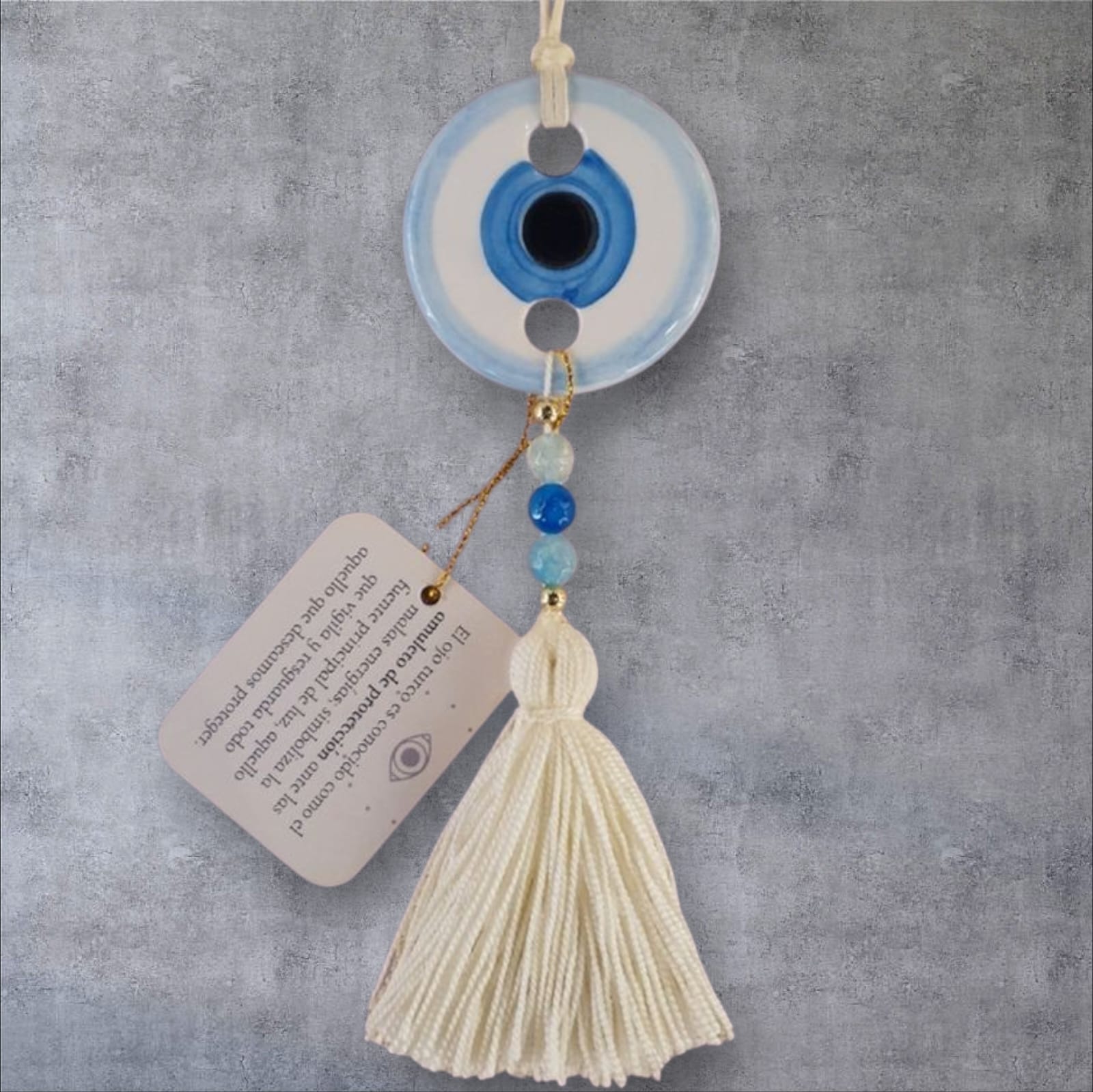 Amuleto artesanal en cerámica blanca pintado a mano, con cuarzos naturales y cinta para colgar. El color blanco simboliza pureza, paz y renovación. Un escudo energético sutil que armoniza tus espacios con belleza e intención 🧿✨