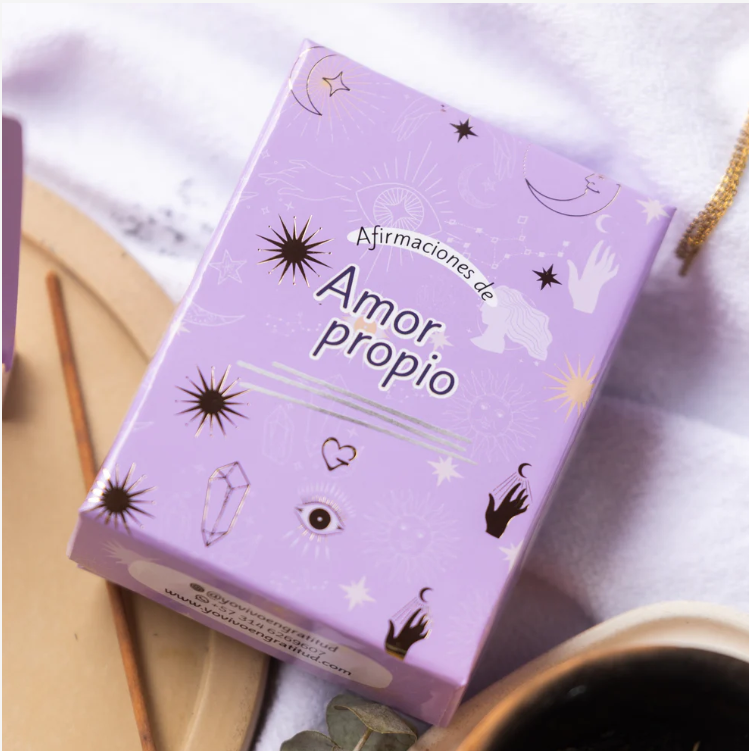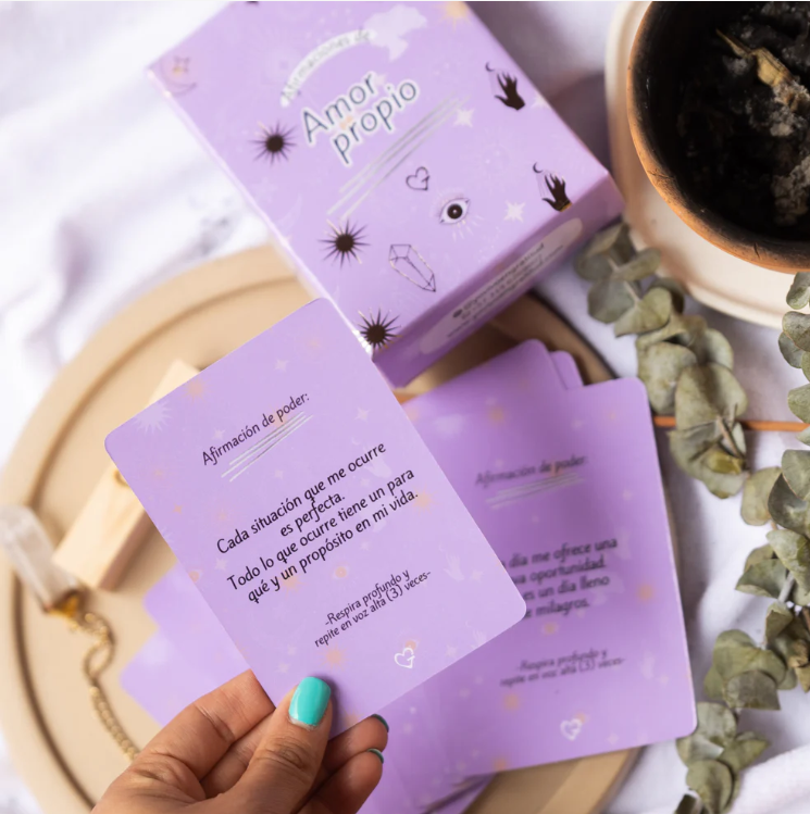 Un oráculo con 42 cartas de afirmaciones, meditaciones guiadas y una base de madera para exhibir tu carta del día. Una herramienta amorosa para elevar tu autoestima, reconectar con tu esencia y cultivar tu amor propio. 💕