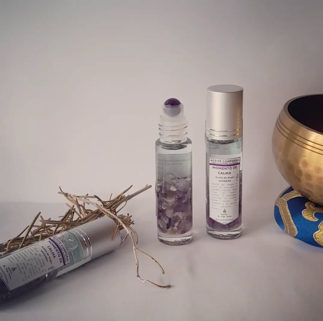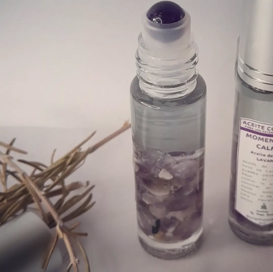 Este roll-on está formulado con aceite de argán, lavanda y la energía sutil de la amatista, conocida como la piedra de la calma y la claridad. Es tu aliado perfecto para reducir el estrés, calmar la ansiedad, favorecer el descanso profundo o acompañarte en tu práctica de meditación.