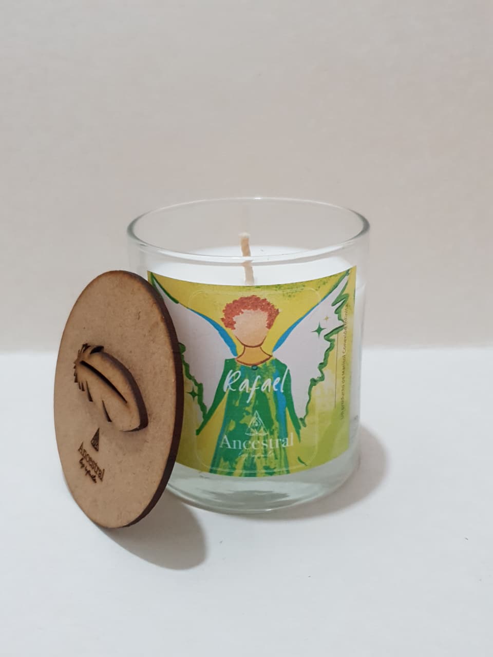 Vela artesanal de 10 oz inspirada en la energía sanadora del Arcángel Rafael. Con aroma a eucalipto, menta y romero. Incluye tapa de MDF con diseño exclusivo y caja decorativa. Ideal para rituales de salud, equilibrio y renovación 💚🌿.